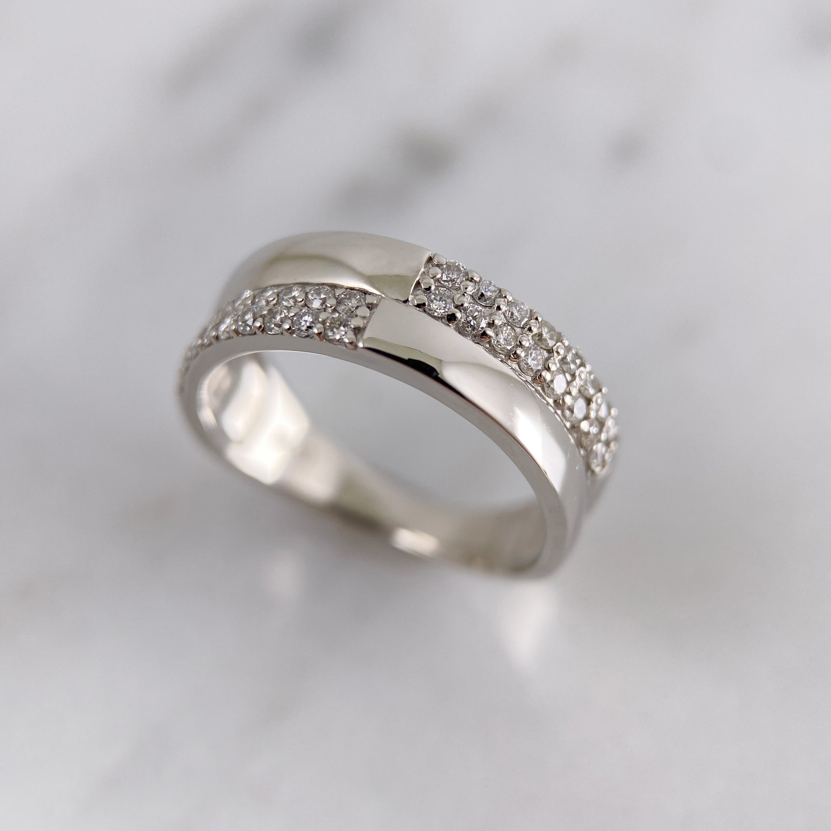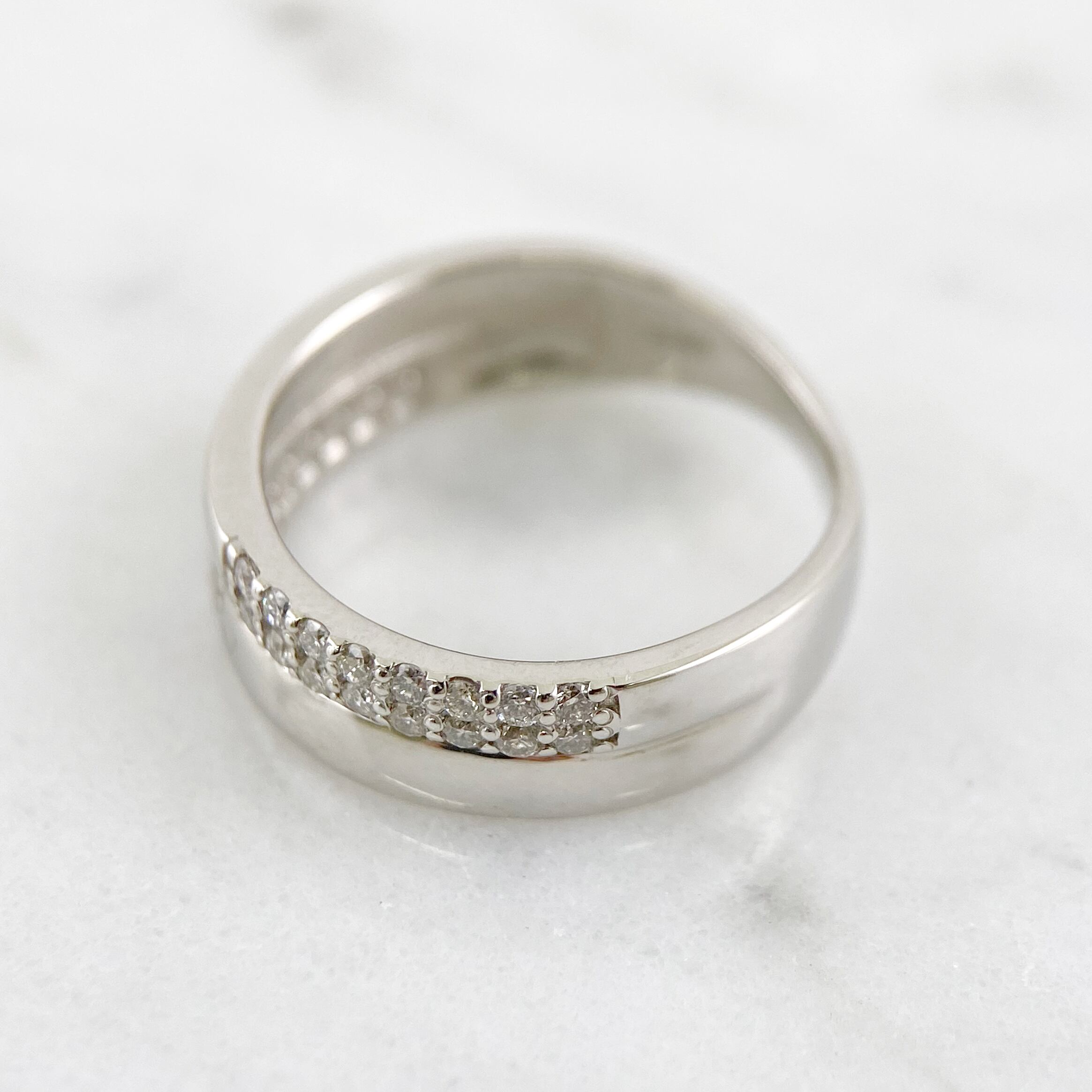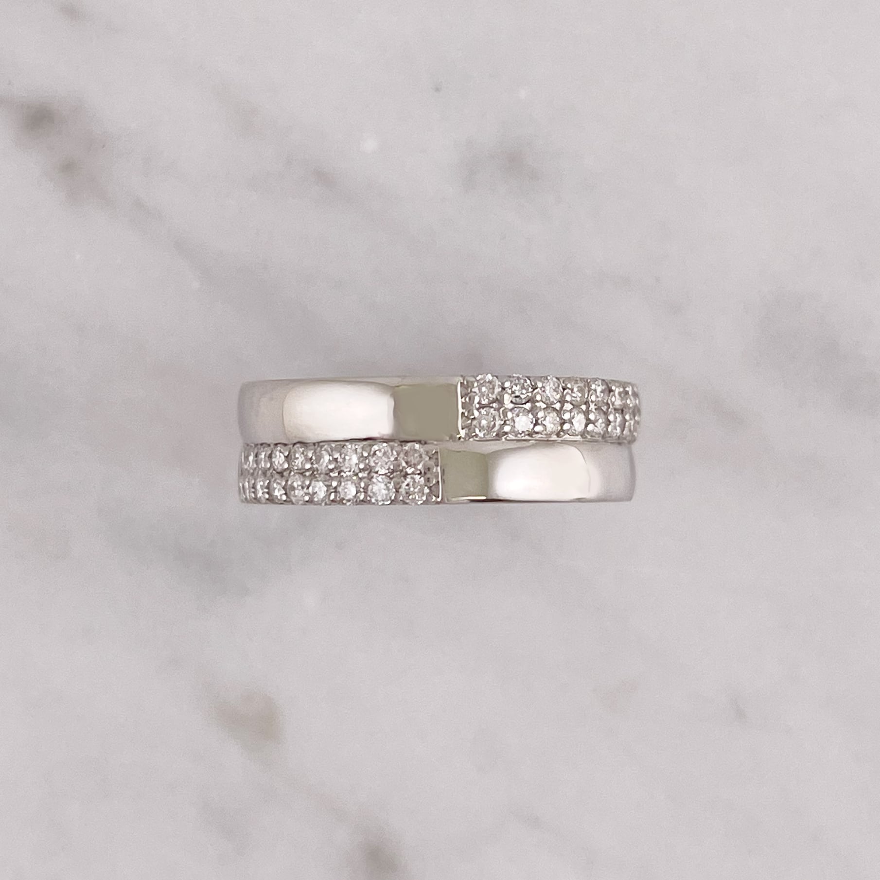 モードな印象のリングで他のどんなジュエリーとも相性よく馴染んでくれる名品です、直線的な印象はマニッシュなコーディネートにも、そして少しのカーブを持たせた曲面が柔らかいフェミニンなコーディネートにも馴染んでくれます。