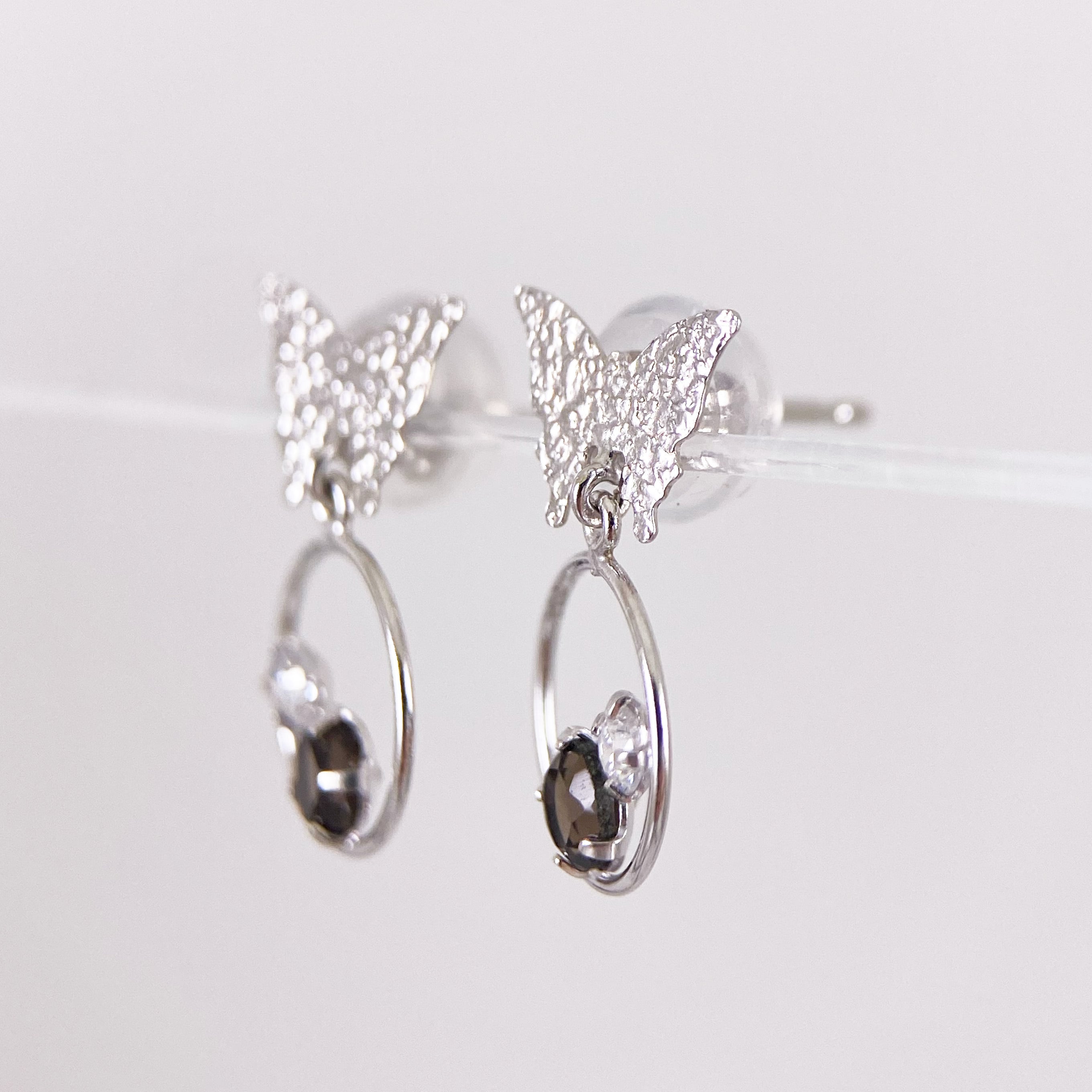 シルバーカラーの蝶とスモーキークォーツが、シンプルなスタイルに華やかさをプラスしてくれます。