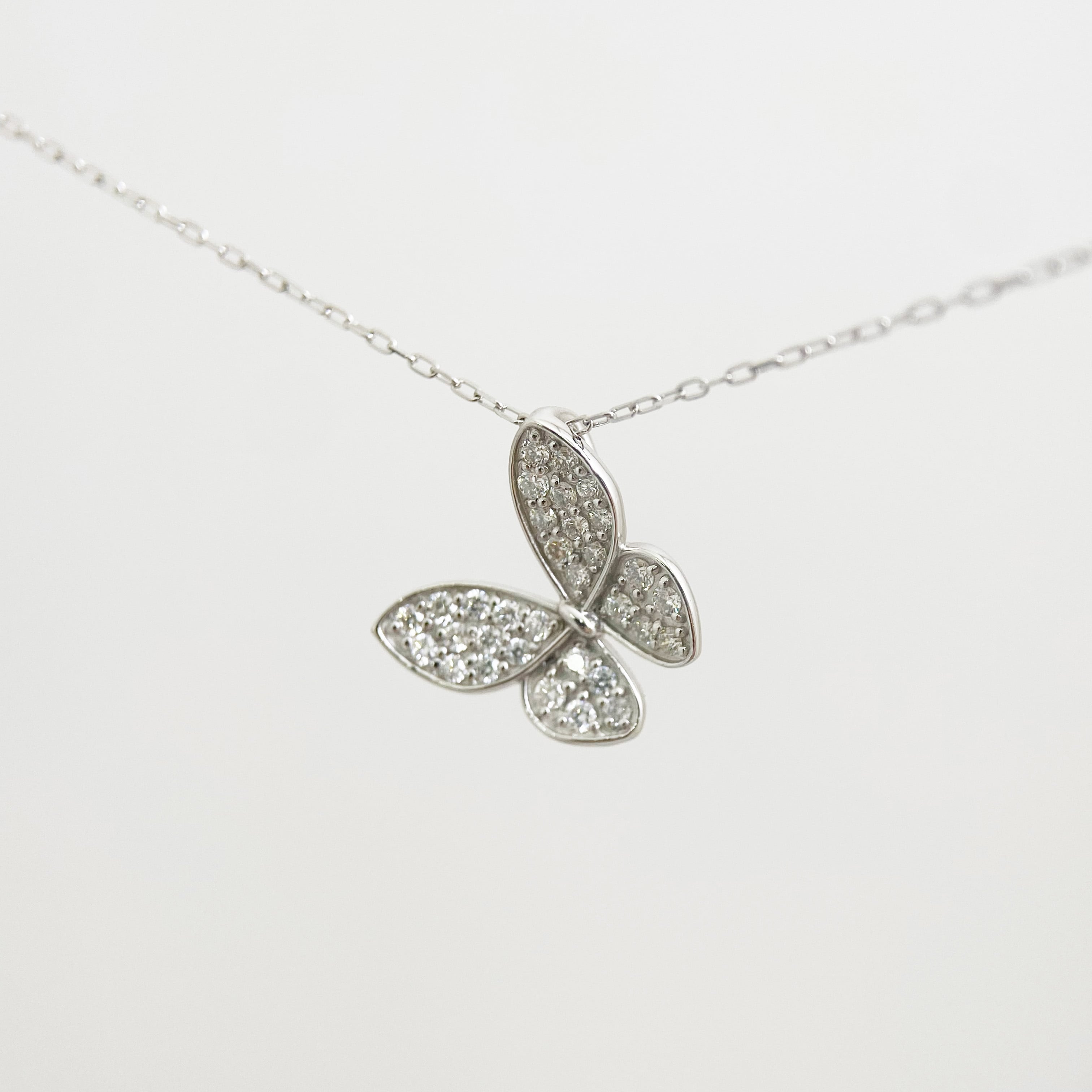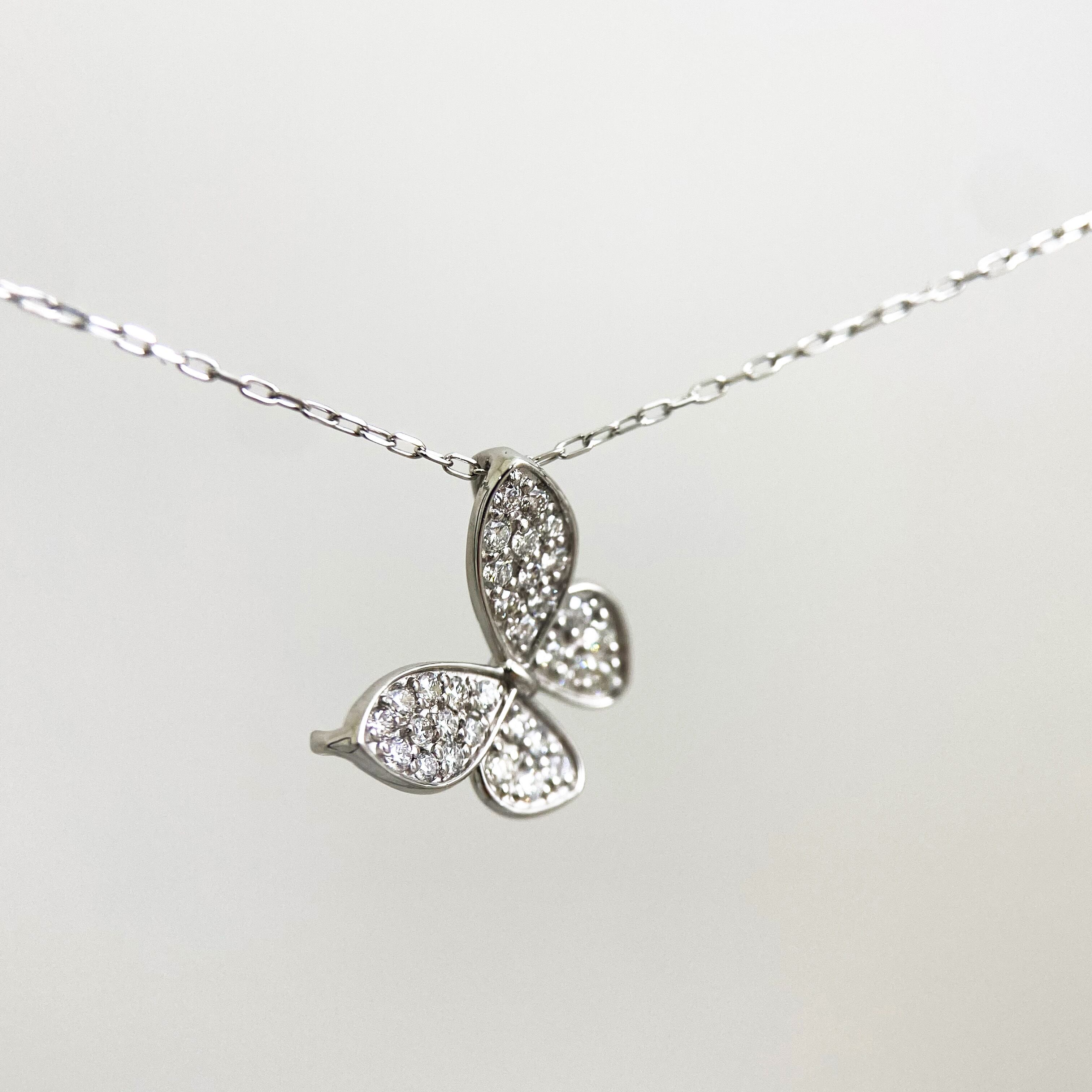 プラチナで美しく形作られた蝶々モチーフには、輝くダイヤが敷き詰められており、上品な魅力を放ちます。どんなシーンでも装飾として際立つ一品で、特別な日や日常のコーディネートに華やかなアクセントを加えます。スライドボールチェーンでお好きな長さでお使いいただけます。