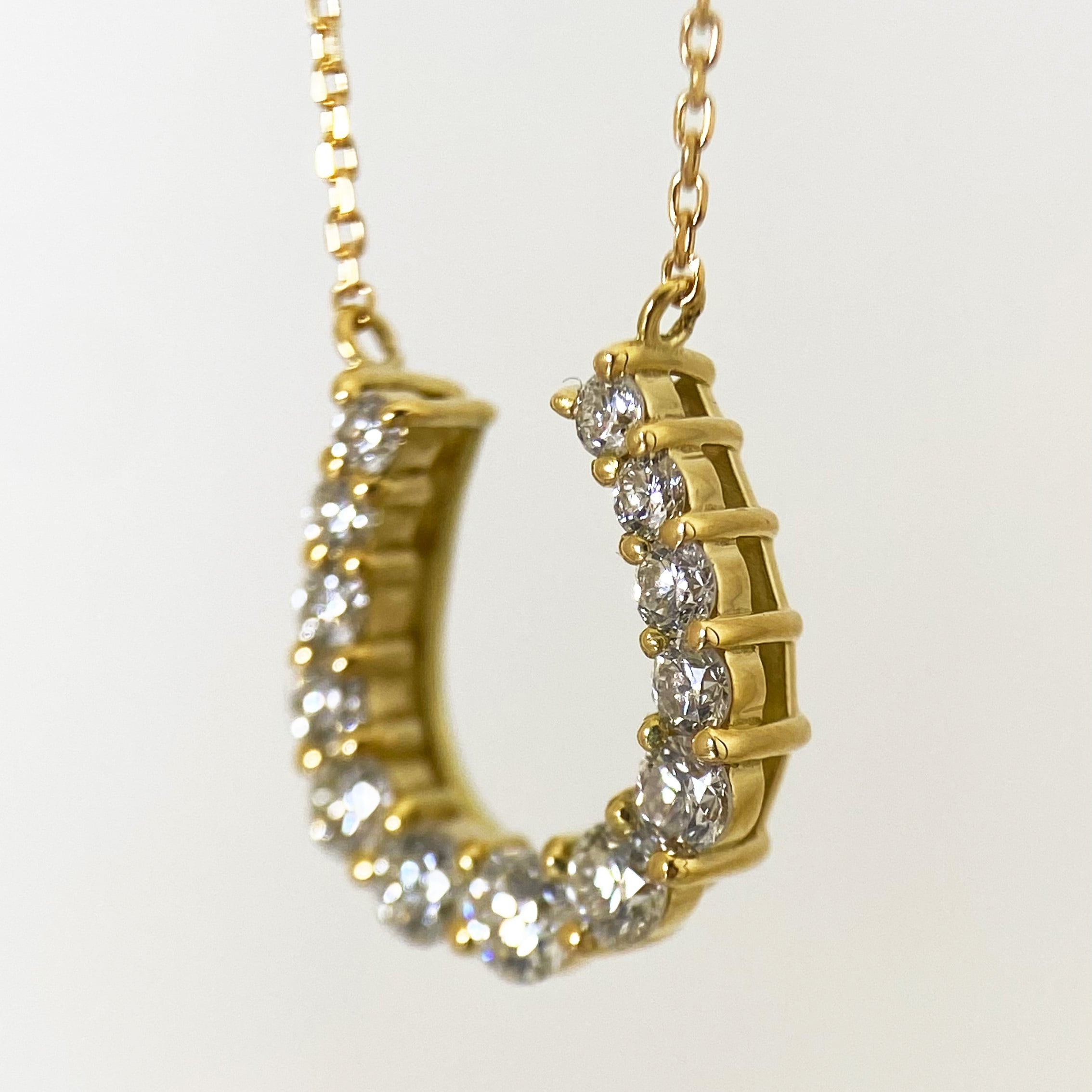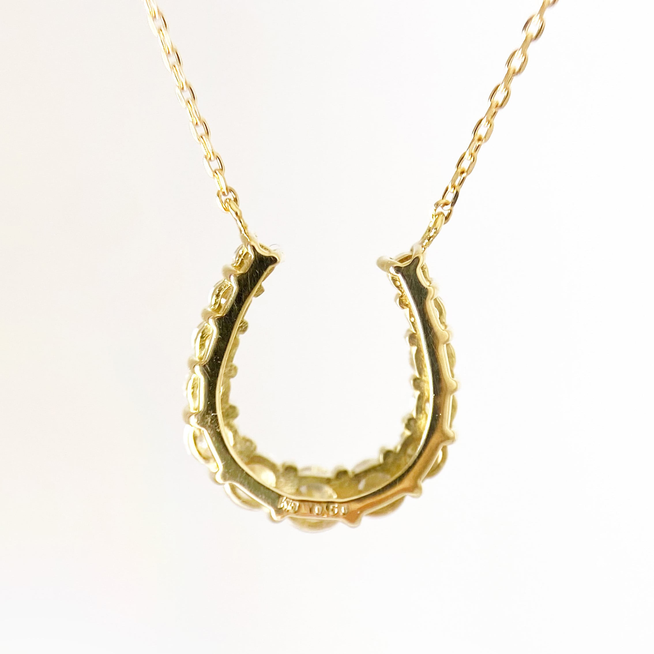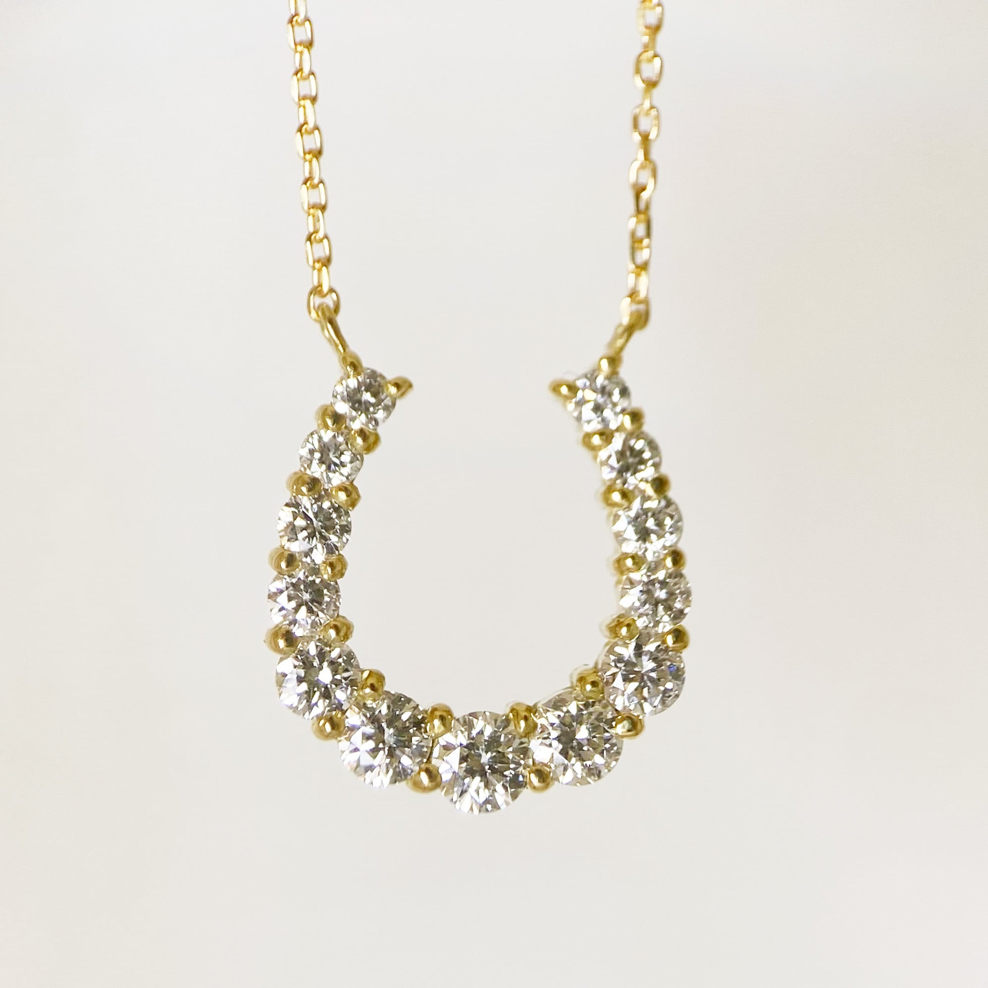 このネックレスは、馬蹄モチーフのネックレスで、幸運を呼ぶ象徴として愛されているアイテムです。K18ゴールドの上質な輝きに、ダイヤモンドの煌めきが加わり、華やかさとエレガンスを放ちます。特別な日のおしゃれはもちろん、日常使いにもぴったりで、どんなスタイルにもマッチします。